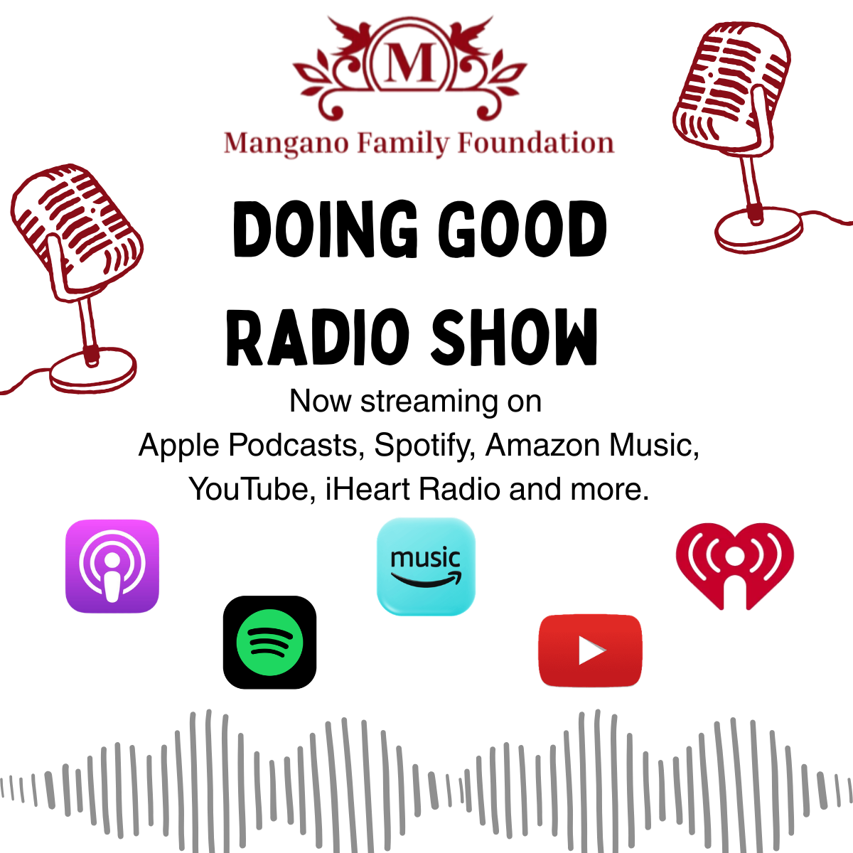The Mangano Family Foundation Doing Good Show is officially live on major podcast platforms. Tap the link below to find us on Apple Podcasts, Spotify, Amazon Music, YouTube, iHeart Radio and more, and don’t forget to hit follow so you never miss an episode. You can also copy the RSS feed and paste it into