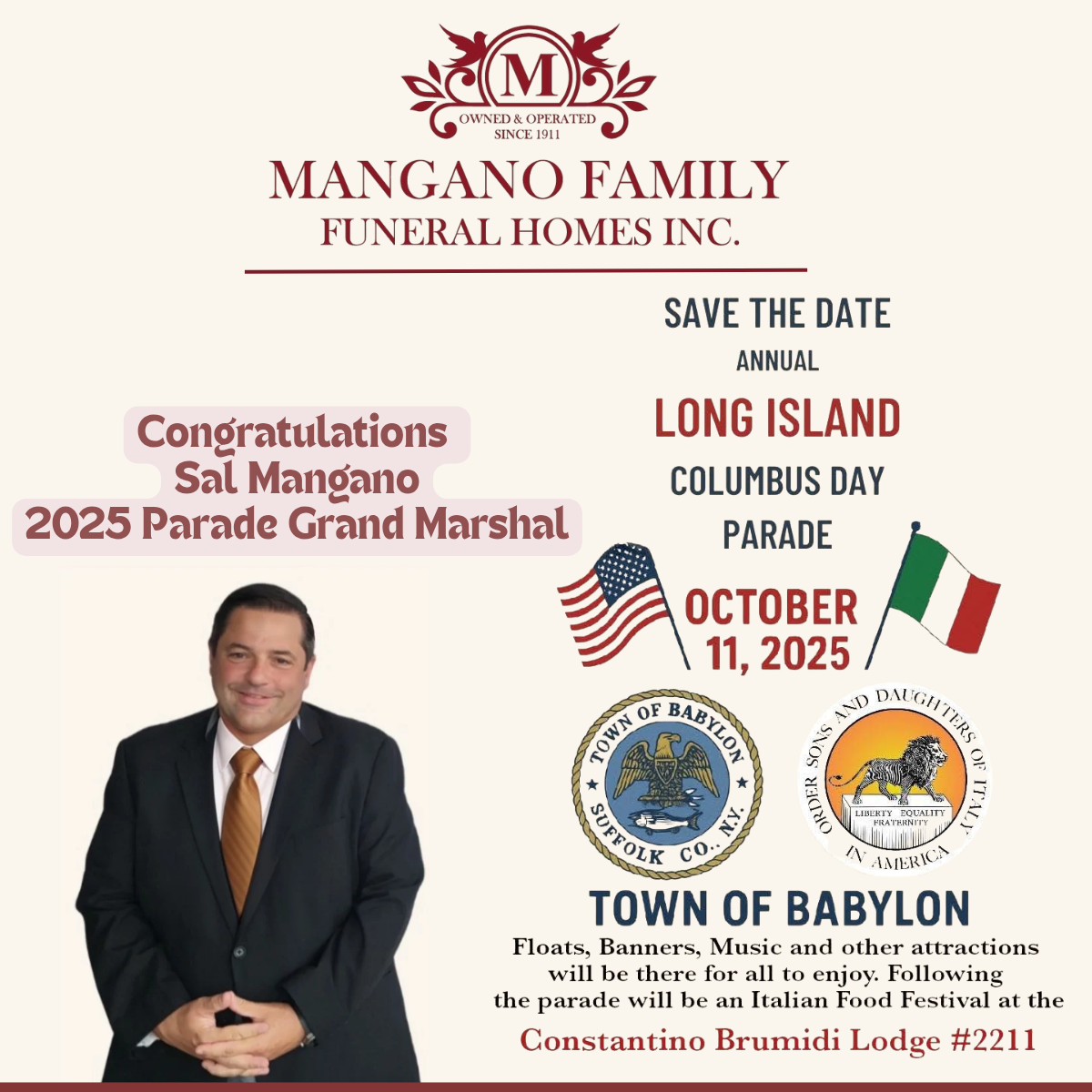 We hope you will join us this Saturday, October 11, as Sal Mangano, President of Mangano Family Funeral Homes, will serve as Grand Marshal of the Long Island Columbus Day Parade. Thank You to the