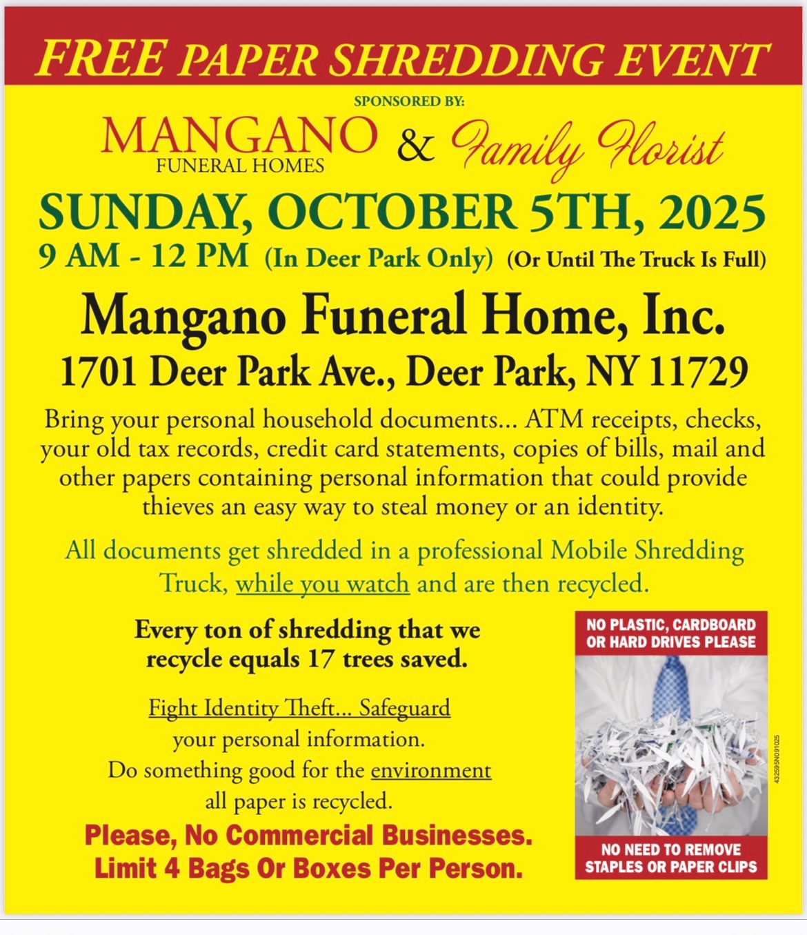 Mangano Family Funeral Homes & Family Florist Offer Free On-Site Paper Shredding Event for Deer Park Community