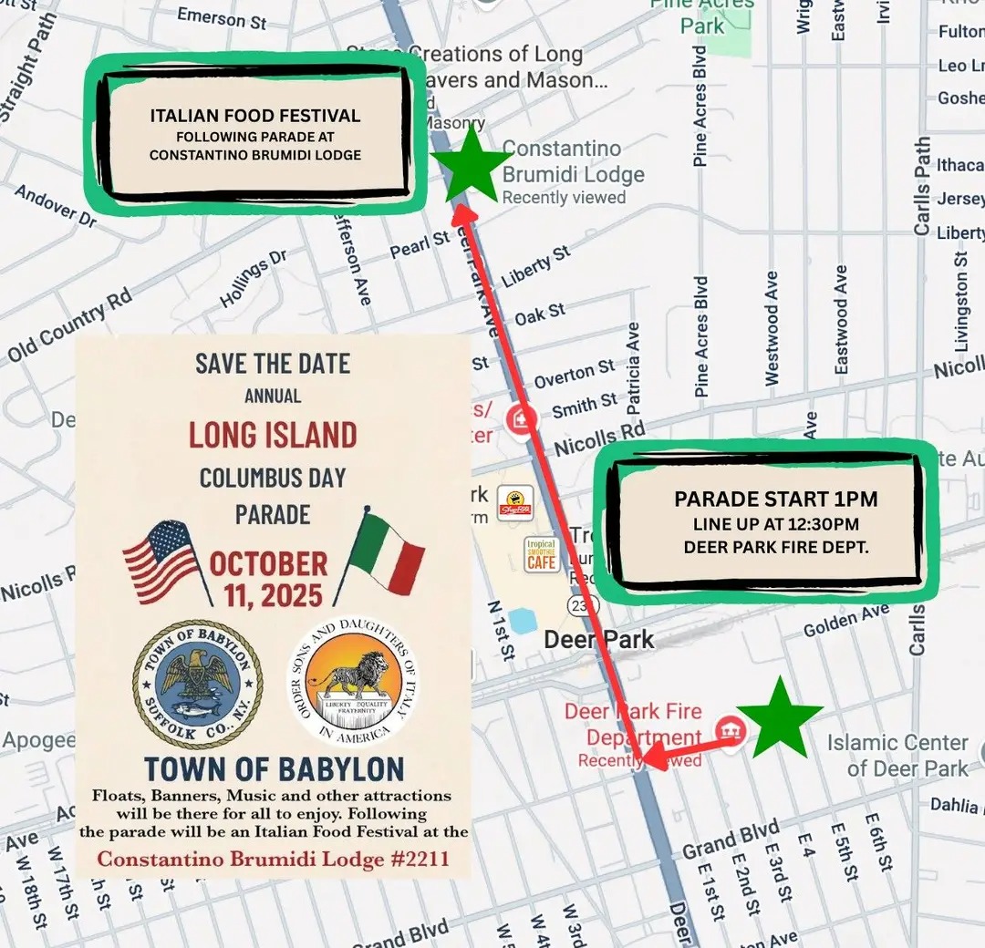 It’s parade time! Join us this Saturday, October 11 for the Long Island Columbus Day Parade in Deer Park. The parade kicks off at 1PM from the Deer Park Lake Avenue Firehouse with Sal Mangano,