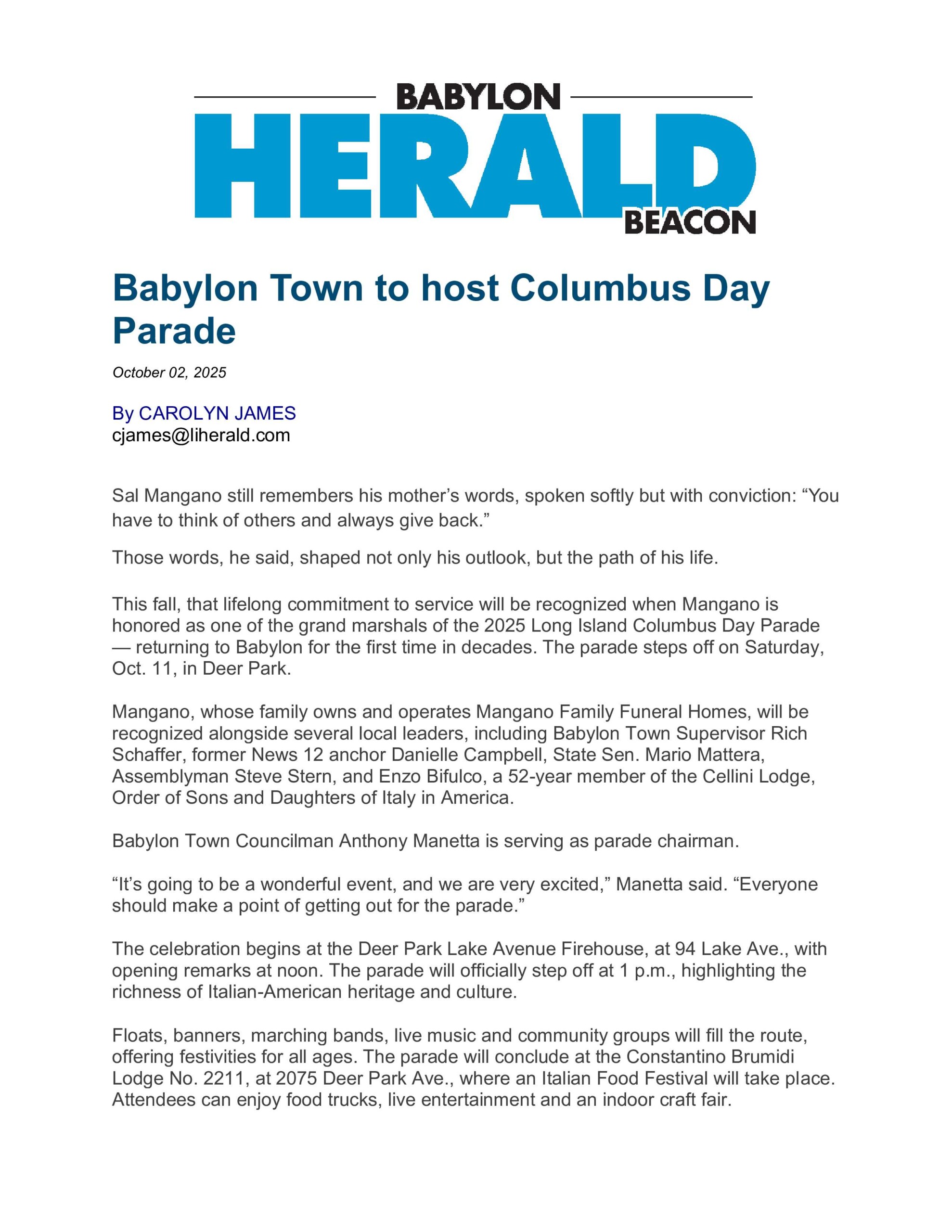 We’re proud to share that Sal Mangano, Founder of Mangano Family Foundation, President of Mangano Family Funeral Homes and longtime community supporter, has been named a Grand Marshal of the 2025 Long Island Columbus Day